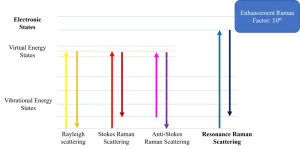 The Raman resonance effect produces an increase in Raman intensity up to 106 times. In this phenomenon, the monochromatic light interaction with the sample produces the transition of the molecules from the fundamental state to an excited electronic state, instead of a virtual state as in normal Raman spectroscopy. This phenomenon of increased intensity could be observed in materials such as carbon nanotubes.[9]