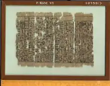 The Ramesseum magician's box is a container discovered in 1885–1886 in a tomb underneath the Ramesseum by Flinders Petrie and James Quibell, containing papyri and items related to magical practices.[1]