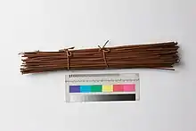 The main discovery in the box is the papyri and the reed pens, which were probably used to write the texts. The text is written in hieratic, with a structure of horizontal and vertical lines. The papyri is mostly in fragments and conservation efforts have been used to save what remains. The papyri fragments were taken to the University College London, where Petrie and Percy Newberry unrolled some of the text onto glass, and used beeswax, in an attempt to hold the fragmentary pieces together.[9] Alan Gardiner disagreed with this method and convinced Petrie to send the papyri to Hugo Ibscher in Berlin. Ibscher's conservation work took place in both London and Berlin. He laid some of the texts onto gelatin and placed them between two pieces of glass. Gardiner and Ibscher catalogued and numbered the papyri for the British Museum and the Berlin Egyptian Museum.