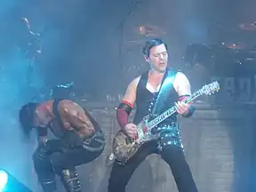 The Denver Post wrote that "[Rammstein] proved that they not only synthesized the Neue Deutsche Härte genre, but that they successfully made it an art."[68] Pioneers of the genre, Rammstein's style blended "alt-metal, groove and electronica".[69] The Guardian wrote, "Ostensibly the world's biggest industrial metal band, Rammstein sound like a mixture of Laibach's situationist anthems, Front 242's 'electronic body music', German drinking songs, opera [and] T Rex-like riffs".[70] Loudwire wrote that the band's "jawdropping, pyro-filled live shows have become as much a part of their identity as their gothy, distortion-saturated melodic electro-metal".[71] IGN said that "The band alternates repetitive metal power chords and atmospheric tones for a mind-numbing blend of metal and electronic music."[72] Rammstein were also described as a gothic metal band who are "Marilyn Manson meets 'Sprockets'".[73] The Bulletin wrote that "Rammstein crank out the kind of symphonic metal you'd expect from a country that boasts Wagner among its favourite sons."[74] AllMusic described the band's music as blending "industrial noise, grinding metal guitars, and operatic vocals".[75] PopMatters said that Rammstein was "mistakenly lumped in with the nu-metal fad that was going on at the same time" as the band's debut.[76]
