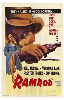 Ramrod is a 1947 American Western film directed by Andre DeToth and starring Joel McCrea, Veronica Lake, Preston Foster and Don DeFore. This cowboy drama from Hungarian director DeToth was the first of several films based on the stories of Western author Luke Short. DeToth's first Western is often compared to films noir released around the same time. Leading lady Veronica Lake was then married to director DeToth. The supporting cast features Donald Crisp, Charles Ruggles, Lloyd Bridges and Ray Teal.
