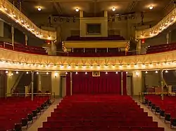 The theater features two balconies with private viewing boxes along the main floor. The seating has been cut back to 489 from its original capacity of 1200, one reason being the upper balcony has been closed-off to the public because of fire safety. Two seating boxes are located almost on each end of the stage with two additional ones in the lower balcony.[3] An unusual feature of the interior is that the balconies are in the general shape of a horseshoe.[3] The auditorium has been altered more than the outside of the building, the major difference in the present interior being the addition of a projection booth in the middle of the top balcony.[4]: 48 Though the specific date the booth was constructed is unknown, it was built sometime before April 1925 — a 2012 article in The Manistee News Advocate quotes its April 8th edition: “The Ramsdell has been equipped with two of the latest type motion projection machines and they are already in place in a fireproof room at the rear of the balcony."[5]