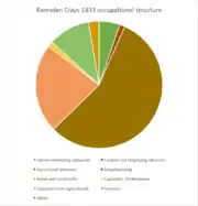 The earliest known record of occupation in Ramsden Crays was in 1831, it listed males over the age of 20 in 9 different occupation categories. Similar to the occupational structure of 1881, agriculture was the dominant employer with 47 of the 75 listed working in agriculture, predominately as labourers. 17 men worked in retail and handicraft, this field was most likely split into more clear-cut roles for the 1881 census and beyond. Nearly every other role were occupied by 1–2 men. Some roles not occupied by men may have been occupied by women who were not recorded at the time of recording.[7]