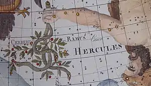 It was depicted in the form of a branch held in Hercules' left hand.[1] The also obsolete constellation of Cerberus - made up of much the same stars - became combined with it in later depictions, with the name "Cerberus et Ramus".[2]