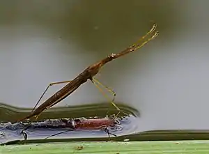 The body of these brown insects is typically 3โ3.5 cm (1.2โ1.4 in) long.[3] Their breathing tube tail is usually about as long as the body of the insect. They are swimming insects, and the adults can fly.[4]