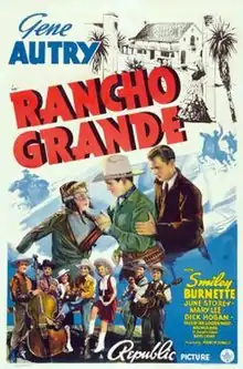Rancho Grande is a 1940 American Western film directed by Frank McDonald and starring Gene Autry, Smiley Burnette, and June Storey. Written by Bradford Ropes, Betty Burbridge, and Peter Milne, based on a story by Peter Milne and Connie Lee, the film is about a singing cowboy and ranch foreman responsible for completing an important irrigation project and for the three spoiled grandchildren of his former boss who come out West to the ranch they inherited.[3]