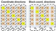 One can naturally extend this algorithm not only just to coordinates, but to blocks of coordinates. Assume that we have space . This space has 5 coordinate directions, concretely in which Random Coordinate Descent Method can move. However, one can group some coordinate directions into blocks and we can have instead of those 5 coordinate directions 3 block coordinate directions (see image).