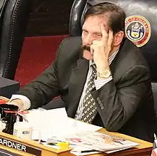 Megan Creeden, a legislative intern, accused Baumgardner of sexual harassment in which he slapped her butt and of making inappropriate comments.[13][14] She filed a sexual harassment complaint against him in 2017.[15] Baumgardner denied the allegations against him, but stepped down as chair of a committee. Senate President Kevin Grantham only requested for him to attend sensitivity training.[16] The Democratic members of the state senate attempted to have Baumgardner expelled, but it failed in a seventeen to seventeen vote, below the twenty-four votes needed, which Senator Don Coram (R) called a "public lynching". Senator Ray Scott was the only Republican to vote in favor of expelling Baumgardner.[17]