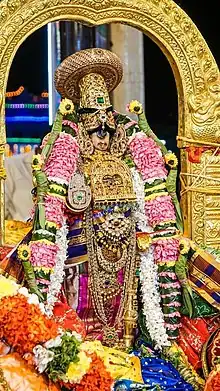 After nearly six decades when Madurai Sultanate ruled after the Pandyan rulers were ousted after the repeated Delhi Sultanate's invasions, the Vijayanagara Empire ousted the Madurai Sultanate in 1378.[32][33][34] Thereafter, the image of Namberumal was brought back to Srirangam.[31] Before then, for decades the deity and the priestly wardens wandered and secretly carried the temple's icon through villages of Tamil Nadu, Kerala and Karnataka. They finally went to the hills of Tirumala Tirupati, where they remained until the temple was rebuilt in 1371.[35] The icon was consecrated again according to the legends. This time, in memory of the first Sultan's daughter which tradition calls Thulukha Nachiyar, a niche in the temple was built for her. The niche shows her as a girl sitting on a horse that carried her to Delhi. Her legend is still remembered. During contemporary processions when the icon is taken out of sanctum and then returned to it after its journey, Thulukha Nachiyar is dressed in Muslim garments and food offerings are made to her in the form of butter and chappathis (wheat bread).[36]