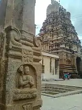 The temple has an imposing tower over the entrance gate (gopura) and two large concentric rectangular enclosures (prakara) around its perimeter. The entrance to the inner sanctum (garbhagriha) is through multiple columned halls (mantapa).[4] A vestibule (sukhanasi), hall (navaranga or just mantapa) and a front hall (mukhamantapa) are the other main structures in the temple. The roof of the mukhamantapa is decorated with a "garland" ("hara") of miniature decorative towers (called "kudu" and "sala" shikharas) whose niches contain stucco images of the god Vishnu.[2]