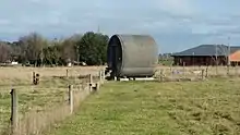 A section of reinforced concrete pipe manufactured for the RDR scheme was retained and installed at a site in Methven that was formerly the Public Works Department's headquarters and the workers' accommodation camp for the scheme. Approximately 800 of these pipe sections were installed to complete the RDR project. The pipe section is 3.65 m in diameter, and is mounted on a base that was a pre-cast control gate for the water race. Concrete ends were installed and a timber floor fitted to turn the pipe section into a storage space. The Pipe Shed has been used for various purposes including an explosives store.[17]