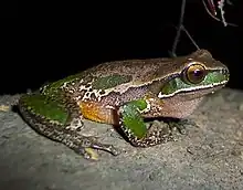Davies' tree frog is a medium-size species which grows to a maximum snout-to-vent length of 53 millimetres (2.1 in) for males and 63 millimetres (2.5 in) for females. The colour of the upper surface is somewhat variable, being mainly golden brown with darker brown patches but sometimes additionally having green patches. There is a narrow brown stripe running from the nostrils through the eye and back towards the groin, broadening towards the posterior and then becoming intermittent. Below the eye is a green band running as far as the shoulder and there is a thin white line along the edge of the upper lip. The skin on the underside has fine granulations. Davies' tree frog is very similar in appearance to the closely related New England tree frog but is larger, is less green and has a slightly bumpy rather than a smooth skin.[2]