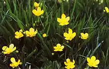 Ranunculus alismifolius is a species of buttercup known by the common name plantainleaf buttercup.[1] It is native to western North America from British Columbia to California to Colorado, where it grows in moist mountain habitat such as meadows, streambanks, and bogs, becoming common to abundant in some places. It is somewhat variable in appearance and there are several varieties which can be hard to tell apart. In general the plant is a perennial herb producing a few usually upright to erect, branching stems from a fleshy, fibrous root system. It can be up to half a meter tall, or it can remain quite short and clumpy. The leaves vary in shape, the lower ones with oval blades and the upper linear to lance-shaped, all borne on long petioles. The inflorescence bears one or more flowers, each on a long pedicel. The flower has up to 12 yellow petals and many yellow stamens and pistils at the center. The fruit is an achene, borne in a spherical cluster of 12 or more.