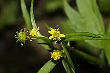 Ranunculus uncinatus is a species of buttercup known by the common names woodland buttercup[1] and little buttercup. It is native to western North America from Alaska to California to New Mexico, where it grows in wet, wooded habitat such as forest streambanks. It is a perennial herb producing a slender, erect stem which may exceed half a meter in maximum height. The lightly hairy lower leaves have blades deeply divided into three toothed lobes borne on long petioles. The upper leaves are smaller and divided into narrower lobes. The flower has four or five yellow petals a few millimeters long around a central receptacle and many stamens and pistils. The fruit is an achene borne in a spherical cluster.