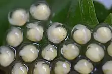 Raorchestes are largely nocturnal, relatively small frogs with adult body size 15–45 mm (0.6–1.8 in) in snout-vent length. They lack vomerine teeth. Males have a large transparent vocal sac while calling. All described species of Raorchestes thus far, show direct development, that is, their life cycle does not involve a free-swimming tadpole stage.[9] Their eggs hatch-out froglets skipping the tadpole stage making them less dependent on water.[9] Raorchestes tinniens eggs took 36 days to hatch and temperature played a huge role in the development times.[10] Different individuals of a species within this genus can be difficult to identify in the field because of color and pattern variations.[6] Species of the genus Raorchestes also have different variations in their iris and pupil coloration.[3] Difficulties in field identifications are leading to more integrative species description practices within the genus.[11] These difficulties have also led to potential misidentification of species and ranges.[12]