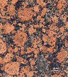Rapakivi granite is a hornblende-biotite granite containing large round crystals of orthoclase each with a rim of oligoclase (a variety of plagioclase). The name has come to be used most frequently as a textural term where it implies plagioclase rims around orthoclase in plutonic rocks. Rapakivi is a Finnish compound of "rapa" (meaning "mud" or "sand") and "kivi" (meaning "rock"),[1] because the different heat expansion coefficients of the component minerals make exposed rapakivi crumble easily into sand.[2]