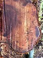 Ceratocystis Huliohia: This fungal pathogen was confirmed by plant pathologist Lisa Keith and her lab team in 2014.[13] Keith and her team asked local Hawaiians what they wished to coin the disease as, and they decided to call it Ceratocystis Huliohia (changes the natural state of ʻŌhiʻa).[13] This fungal pathogen has been found to create a canker disease beneath the bark that slowly spreads throughout the water-conducting tissue within the tree, leading to wilting leaves, dried out branches and ultimately, the death of the tree.[13] In both ROD fungal pathogens, signs of the disease have been shown in the outer ring of the cut trunk.[14] Additionally, scientists have found through systematic dissections of the tree that the darkest portion of the bark is where the fungus has entered, and that predominantly the fungus has been found that the disease grows quicker up the stem of the tree than down it.[14] Researchers have also been studying how the excrement created by Boring Beetle's within the ʻŌhiʻa tree's can be used as a pathway for both pathogens of ROD.[12]