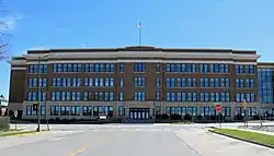 As Rapid City was quickly expanding and needed more classroom space, the Rapid City School District hired Perkins & McWayne to design a new school complex. This new building was to be constructed in three phases; the first phase, consisting of the east wing, lasted from 1922 until December 1923. During this period, it served as the campus's junior high school. Due to the Great Depression, the central and western wings were not completed until May 1937 with the help of the Public Works Administration. It was one of only two buildings designed by Northwestern Engineering Company, which mainly constructed roads. The expanded school—its name reverted back to Rapid City High School by a city-wide popular vote—officially opened to high school students for the fall semester, and junior high classes were moved to the Coolidge Building. Several outbuildings and additions were added in the following decades. A workshop building was added to the southwest side in 1953, and a new boys' gymnasium was built in 1967.[4]