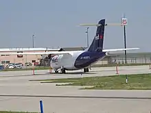 A FedEx ATR-42-600 at the cargo ramp at Rapid City.