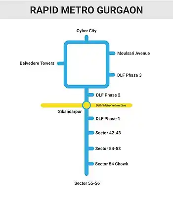 Rapid Metro Gurgaon is a light metro[5][6][7] system serving the city of Gurgaon, Haryana, India.[8] Rapid Metro connects the commercial areas of Gurgaon, and acts as a feeder link to the Delhi Metro with an interchange with its Yellow Line at Sikanderpur metro station.