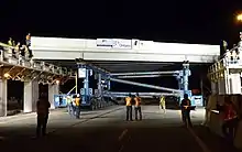 Rapid bridge replacement or accelerated bridge construction (ABC) is a technique that allows bridges to be replaced with minimum disruption to traffic. The replacement bridge is constructed on a site near the bridge to be replaced. When it is completed, the old bridge is cut away and removed using self-propelled modular transporters (SPMTs). Then the SPMTs lift the new bridge, transfer it to the work site and put it in place.[1] Often the highway or railroad carried by the bridge is closed for just one weekend. Conventional techniques typically replace half a bridge at a time, with all highway traffic redirected under the other bridge half, often for a year or more, while construction progresses. Accelerated bridge construction (ABC) alternatives consist of ABC components and ABC techniques. Components can be categorized into prefabricated bridge elements (e.g. beams, bridge decks, footings, columns, pier caps, abutments etc.) or prefabricated bridge systems (e.g. bridge modules with superstructures and/or substructures).[2][3] ABC involves fabrication of these elements or systems off-site in a regulated environment, and transporting those to site for installation. Related processes such as lifting, placement, transportation, embankment construction are termed as ABC techniques.[4]