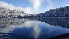 Rara Lake lies at an elevation of 2,990 m (9,810 ft), has a water surface of 10.8 km2 (4.2 sq mi), a maximum depth of 167 m (548 ft), is 5.1 km (3.2 mi) long and 2.7 km (1.7 mi) wide. It drains into the Mugu Karnali River via the Nijar River.[7] Its water quality is characterized by high pH, conductivity and total hardness. It has been classified as oligotrophic as it is slightly polluted.[8] The lake changes its colour up to 5 times a day depending on the climate.[9][10][11] Rara Lake is surrounded by thickly forested hills named Chuchemara Danda at 4,087 meters and Murma at 3630m. Behind the hills, the beautiful view of Saipal Mountain of Himalayan Range can be seen from the lake. One revolution of the lake by foot takes almost five hours.[6] During, summer season, birds as far as Siberia can be found migrating to this area.[12]