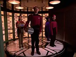 ![]() Twelve-year-old versions of Keiko, Picard, Guinan and Ro on the transporter pad | |