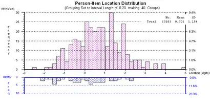 Figure 2: Graph showing histograms of person distribution (top) and item distribution (bottom) on a scale