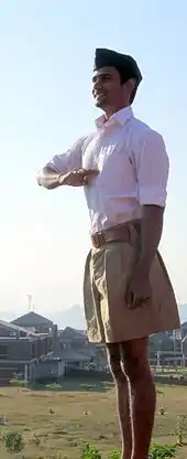 In accordance with Hedgewar's tradition of keeping the RSS away from the Indian Independence movement, any political activity that could be construed as being anti-British was carefully avoided. According to the RSS biographer C. P. Bhishikar, Hedgewar talked only about Hindu organisations and avoided any direct comment on the Government.[54] The "Independence Day" announced by the Indian National Congress for 26 January 1930 was celebrated by the RSS that year but was subsequently avoided. The Tricolor of the Indian national movement was shunned.[55][56][57][58] Hedgewar personally participated in the 'Satyagraha' launched by Gandhi in April 1930, but he did not get the RSS involved in the movement. He sent information everywhere that the RSS would not participate in the Satyagraha. However, those wishing to participate individually were not prohibited.[59][60] In 1934 Congress passed a resolution prohibiting its members from joining RSS, Hindu Mahasabha, or the Muslim League.[55]