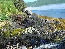 Sitka spruce is one of the dominant trees on Raspberry Island. Spruce forests are interrupted by fields of salmonberry bushes, alders and wildflowers. Higher elevations have wild blueberry and cranberry bushes with more grasses. Wildlife of note on the island includes Sitka deer, red foxes and Kodiak bears, as well as tufted puffins and bald eagles.[1] Afognak and Raspberry islands are the only locations in Alaska with elk populations.[2] The island's Roosevelt Elk developed from eight calves translocated from Washington state's Olympic Peninsula in 1928.[3] The elk have adapted well to the island, with some mature bulls weighing nearly 1,300 pounds (590 kg).[4] The muskrat is another species that was successfully introduced to the island.[2] Whales commonly meander down Raspberry Strait but must turn around because it becomes too shallow for them to pass all the way through. Kayakers take advantage of this phenomenon to wait for them to pass by again on their way back out to deeper water. Bald eagles are abundant.