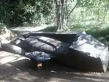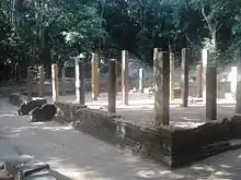According to archaeological sources, the temple belongs to the most prosperous era in Sri Lankan history. Many dagobas, temples, ponds, shrine rooms and sandakadapahana(moonstone) have been discovered from the site. Amongst the ruins are two most important antiquities. The first of these is a large and beautifully made stone bowl. Such bowls were used for offering the first fruits of the harvest to the Buddha. Further in the jungle there is a large block of stone about 16 feet (5 m) long with a half-carved Buddha image. All the lines on the statue are straight and at right angles to each other and there are no details. Archaeologists believe that apprentice sculptors had carved the images leaving them to be perfected by master sculptors. However, the statue remains unfinished.[1][7]