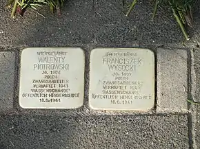The policy of prohibiting sexual relations between Germans and foreign workers was pursued to the extent that a case emerged of two young German women, one (aged 16) who was raped and the other (aged 17) who was sexually assaulted, had their heads shaved and were paraded through the streets with placards around their neck stating they were "without honor".[34] The event was met with complete disapproval but was pursued to put fear into the German public in order to avoid the Poles.[34] From 1940 onwards, Poles were commonly hanged in public without trial for having sexual intercourse with German women.[35]