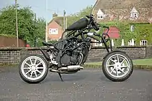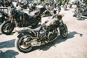 The concept of keeping a motorcycle in at least minimally operational condition without consideration for appearance has probably characterized motorcycle ownership since its earliest days.[2] The essence of a rat bike is keeping a motorbike on the road for the maximum amount of time while spending as little as possible on it.[3] This calls for adaptation of parts that were not designed to fit the model of bike in question. While the origin of the term rat bike is unclear, it may be attributable to custom motorbike magazines,[4][5] and retrospectively applied. Most rat bikes are painted matte black but this is not a requirement.[6]