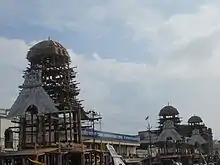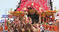 The Ratha Yatra of Puri, also rendered as the Ratha Jatra (Odia: ରଥଯାତ୍ରା, lit.'chariot festival') (/ˈrʌθə ˈjɑːtrɑː/, Odia pronunciation: [ɾɔt̪ʰɔ dʒat̪ɾa]) is an annual Hindu chariot festival celebrated on the bright half of the lunar month of Ashadh (June-July).[1] The festival is associated with the deity Jagannath (a form Vishnu or Krishna) held at the city of Puri in the state of Odisha, India.[1] During the festival, the three deities (Jagannath, his brother Balabhadra and sister Subhadra) are pulled in three massive, wooden chariots to Gundicha Temple whereby they reside there for a week and then return to the Jagnannath temple.[1] It is the oldest Ratha Yatra, whose descriptions can be found in Brahma Purana, Padma Purana, the Skanda Purana, and the Kapila Samhita.[2] This Ratha Yatra is the celebration of the occasion of the deity Jagannath, journeying towards his aunt's house.