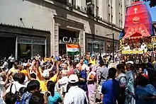 The Ratha Yatra festival has become a common sight in most major cities of the world since 1968 through the ISKCON Hare Krishna movement. By the mercy of Mahaprabhu Shri Jagannath and Chaitanya, A. C. Bhaktivedanta Swami Prabhupada had successfully transplanted the festival which now happens on an annual basis in places all over the world in over 108 cities including; Moscow, New York, Houston, Atlanta, London, Rome, Zürich, Kolkata, Mumbai, Karachi, Berlin, Heidelberg, Cologne, Florence, Wroclaw, Sydney, Perth, Kampala, Nairobi, Mombasa, Kisumu, Mexico City, Dublin, Belfast, Manchester, Birmingham, Alchevsk, Buenos Aires, Madrid, Stockholm, Bath, Budapest, Auckland, Melbourne, Montreal, Paris, Copenhagen, Amsterdam, Los Angeles, Toronto, Vancouver, Santiago, Tallinn, Lima, Antwerp, Sofia, Kuala Lumpur, Dubai, Oslo, Zhongshan, Myitkyina, Bangkok and many other cities.[6] The Ratha Yatra in Dhamrai, Bangladesh, is one of the most important in Bangladesh.