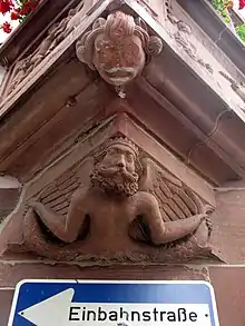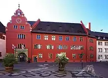 The house facade of the old town hall was painted with scenes from a dance of death in 1559. At the behest of the council, the painter Galienus Entringer had to replace his own painting with a history painting with scenes from the life of Philip II of Macedon in 1560. In 1881, Fritz Geiges replaced the neo-Gothic architectural painting of Simon Gösers of 1810 with paintings in the manner of the Renaissance, but those had to be revised in 1886 because of damage. Today, the building is plastered uniformly in sandstone red. The windows are framed in black and gold with colorful portals.[2][3]