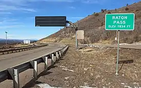 Ratón Pass is a 7,834 ft (2,388 m) elevation mountain pass on the Colorado–New Mexico border in the western United States. It is located on the eastern side of the Sangre de Cristo Mountains between Trinidad, Colorado and Raton, New Mexico, approximately 180 miles (290 km) northeast of Santa Fe. Ratón is Spanish for "mouse". The pass crosses the line of volcanic mesas that extends east from the Sangre de Cristo Mountains along the state line, and furnishes the most direct land route between the valley of the Arkansas River to the north and the upper valley of the Canadian River, leading toward Santa Fe, to the south. The pass now carries Interstate 25 and railroad tracks.