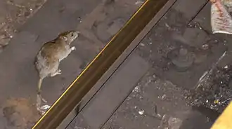 In 2011, a video of a rat climbing on a sleeping man's face on the subway went viral.[96] Rats are so common that ex-Manhattan Borough President Scott Stringer quipped in 2013, "The rats don't scurry. They walk right up to you and say, 'How are you, Mr. Borough President?'"[47] That year, YouTube videos of rats on subway tracks and in a subway car in New York City went viral, as did videos of rats in a Dunkin' Donuts in Manhattan.[97][98][99][100] In June 2014, residents at adjacent Upper West Side buildings started a rent strike, demanding an end to the rat problem.[101] Also in 2014, Allerton Coops in Bronx Park East received three Notices of Violation from the Health Department and was fined for their inadequate response to a severe rat infestation.[102][103][104]