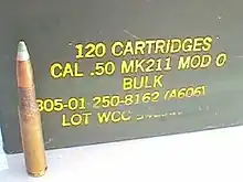 The Mk 211 is a very popular .50 caliber sniper round used in the Barrett M82 rifle and other .50 BMG rifles.[5] It is also often used in heavy machine guns such as the M2 Browning. Due to its popularity, several U.S. arms manufacturers produce the round under license from NAMMO Raufoss AS.[6] However, due to the complex structure of the projectile and consequently high costs (ca US$75 per round), the popularity is restricted to special mission profiles.