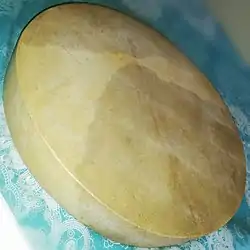 The ravanne is a large tambourine-like instrument used in sega music of Mauritius.[1] It is made out of goat skin called “lapo cabri” (in Mauritian Creole) which usually needs to be heated up before playing.[2] The ravanne is used as the main rhythm in sega music and has been played by the great contributors of the Sega (genre) . One of the main contribution for the ravanne is a book written in 1999 called “Méthode de ravanne”:[3] Ways of playing the "ravanne", traditional music instrument by Menwar (Stéphano Honoré) [4] Throughout the time the traditional ravanne has evolved to more modern ravanne types using different materials and manufacturing techniques. It is commonly used for entertainment mainly in the tourist industry and common family gatherings all around the island.