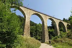 The Ravenna Bridge is a 58-metre (190 ft) high and 225-metre (738 ft) long railway viaduct on the Höllental Railway line in the Black Forest, in Breitnau, Breisgau-Hochschwarzwald, Baden-Württemberg, Germany. The bridge crosses the Ravenna Gorge that ends in the upper Höllental valley, and has a grade of 12 metres (39 ft). The origin of the name most likely comes from the French ravin for gorge.