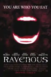 Ravenous is a 1999 horror Western cannibal film starring Guy Pearce, Robert Carlyle, Jeffrey Jones and David Arquette.[2] The film, which is set in 1840s California, was directed by Antonia Bird and filmed in Europe. It was not a box office success and failed to recoup much of its $12 million budget. However, despite initial reception being mixed when released, it has since garnered a reputation as a cult film.[3]