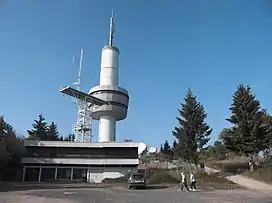 The mountain top is crowned with a prominent 64 m high tower, which was built in 1970. This tower acted as a listening post during the Cold War; today it is used by Deutsche Telekom.
