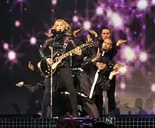 "Ray of Light" has also been featured in the set lists of three Madonna tours – 2001's Drowned World Tour, 2006's Confessions Tour and 2008–2009's Sticky & Sweet Tour. On the Drowned World Tour, it was included as the fifth song on the Neo-Punk segment, where the singer performed it wearing punk inspired clothing, and the backdrop screens showed an extended version of the song's music video. This time, the electric guitar was played by Monte Pittman.[96] Michael Hubbard from MusicOMH noted that "things quickly hotted up with [...] 'Ray Of Light', a track that was quite simply as sublime as it was infectious".[97] In 2005, Madonna performed "Ray of Light" during the Live 8 benefit concert,[98] and a year later at the 2006 Coachella Valley Music and Arts Festival in Indio, California.[99] During her 2006 Confessions Tour, Madonna included a rock version of "Ray of Light" as the second song of the show's third act, the Glam-Punk segment. For this performance the singer played the electric guitar and urged the audience to jump-along. She was accompanied by six male backup dancers, dressed in black outfits and white ties doing a synchronized choreography.[100] Rolling Stone called the performance "hard-rocking".[101]