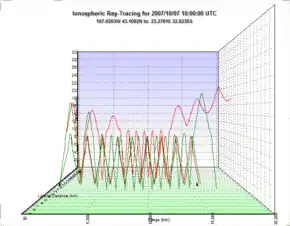 One particular form of ray tracing is radio signal ray tracing, which traces radio signals, modeled as rays, through the ionosphere where they are refracted and/or reflected back to the Earth. This form of ray tracing involves the integration of differential equations that describe the propagation of electromagnetic waves through dispersive and anisotropic media such as the ionosphere. An example of physics-based radio signal ray tracing is shown to the right. Radio communicators use ray tracing to help determine the precise behavior of radio signals as they propagate through the ionosphere.