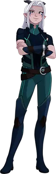 Rayla is introduced as a prodigy, 15 year-old Moonshadow Elf assassin, and the apprentice and protégé of veteran Moonshadow elven assassin Runaan. Sent on a mission to avenge the Dragon King and Prince, she ends up siding with the human princes and half-brothers Callum and Ezran in order to deliver the Dragon Prince back to his mother after learning that the Dragon Prince’s egg was not destroyed. Over the course of the series, Rayla and Callum develop a romantic relationship that becomes strained due her two-year absence on his fifteenth birthday.