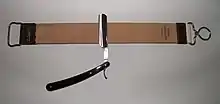 A razor strop or simply a strop (sometimes called a razor strap or strap) is a flexible strip of leather, canvas, denim fabric, balsa wood, or other soft material, used to straighten and polish the blade of a straight razor, a knife, or a woodworking tool such as a chisel. In many cases stropping re-aligns parts of the blade edge that have been bent out of alignment. In other cases, especially when abrasive polishing compound is used, stropping may remove a small amount of metal (functionally equivalent to lapping). Stropping can also burnish (i.e. push metal around on) the blade.[1]