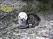 The mating pair will often reuse the same site every year.[29][30] Since chicks cannot fly, nests close to the sea provide easy access when leaving the colony. Generally, razorbills do not build a nest; however, some pairs often use their bills to drag material upon which to lay their egg.[31] Nest under a boulder, rarely on an exposed ledge, may use Puffin or rabbit burrow.[32] Although gregarious in breeding colonies, nests are not contiguous, but some meters apart, resulting in less aggression than in Guillemot colonies.[32]