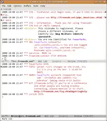 Rcirc is "compact, written in a single file of less than 2,500 lines of code".[1] It allocates separate buffers for each server and channel, and includes tab completion and inbound message timestamps. It allows opening new buffers for composing messages, useful for multiline work. All IRC commands are bound to control-c command shortcuts. Sound alerts are available for private messages and for when a user's nick is mentioned in channel.[1]