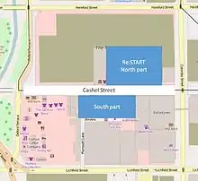 In April 2011, it was announced that part of Cashel Street was to reopen on 29 October 2011. The date was set just prior to Cup and Show Week, where the Canterbury A&P Show is held in the week that coincides with the provincial anniversary day.[3] The initiative was driven by the Restart The Heart Trust, which was set up for the purpose of getting retail back into the central city. The Restart The Heart Trust was given an interest-free loan of $3.36 million by the Christchurch Earthquake Appeal Trust.[4][5] Temporary shops made from shipping containers were fitted out as retail premises, to accommodate 27 shops branded as Re:START.[6] Ballantynes, Christchurch's remaining department store, also reopened and is the retail anchor. Prime Minister John Key officiated at the opening ceremony.[7]
